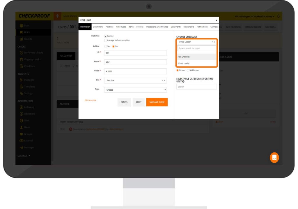 From the “Units” list, select the unit that you want to connect to the checklist.