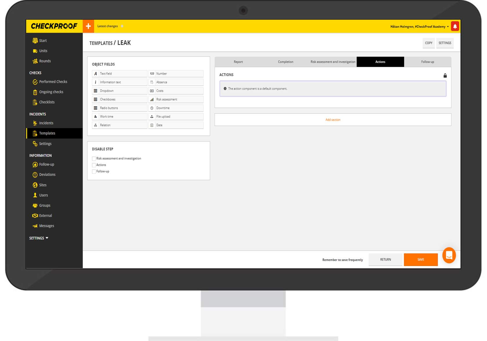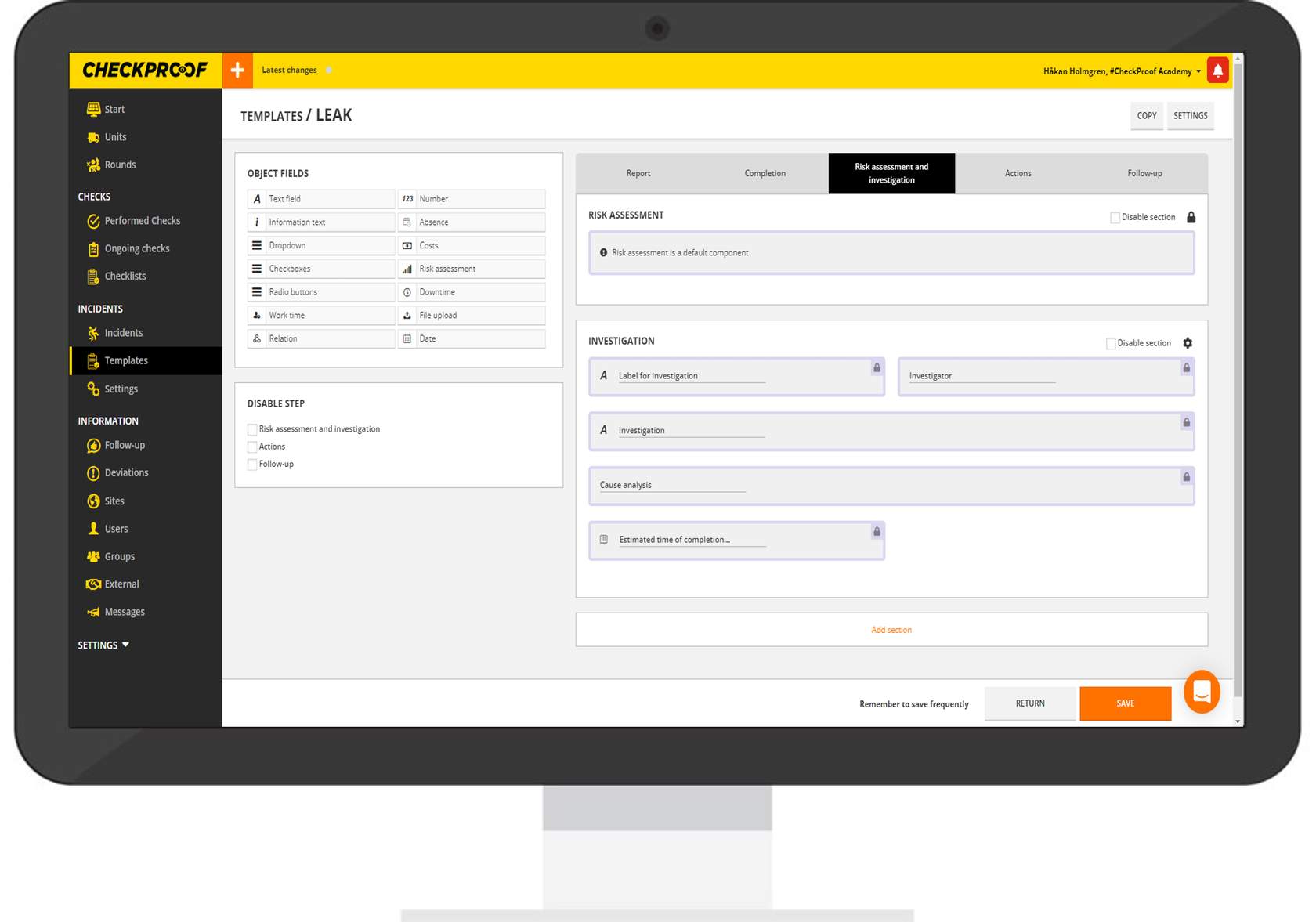 Within this step, you can place a risk assessment with different components by dragging and dropping the necessary “Object Fields” (as seen on the left of the screen) into the template.