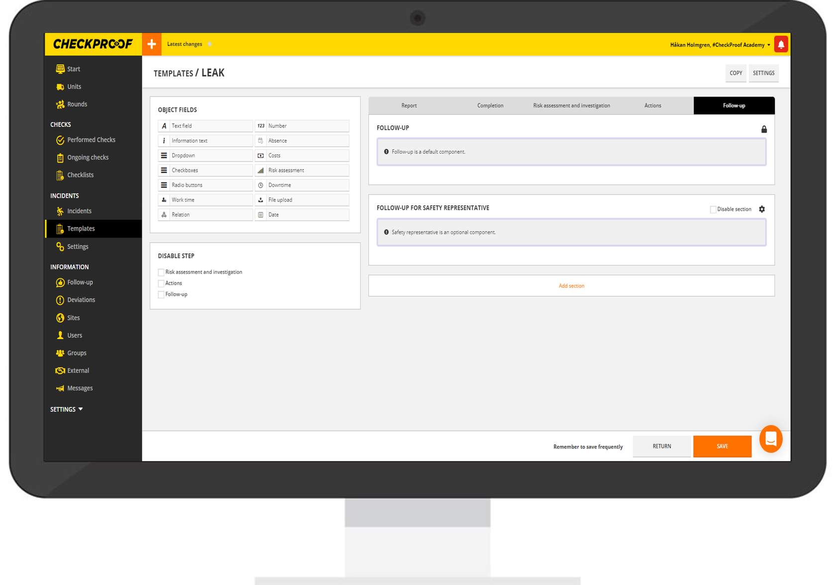 The “Follow-Up” and “Follow-Up for Safety Representative” components are defaults in this section, although the latter can be disabled by checking the “Disable Section” box.
