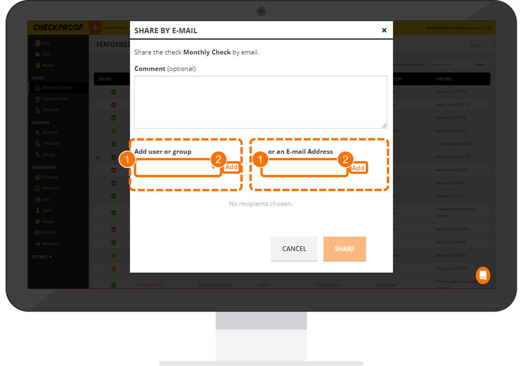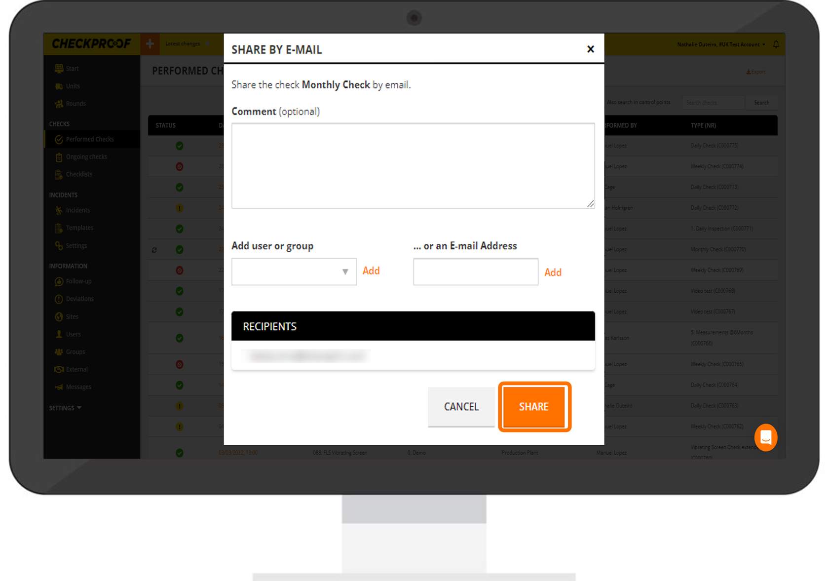 To share a check that has already been performed, you need to click “Performed Checks” in the side panel menu, and then select the check from the list.