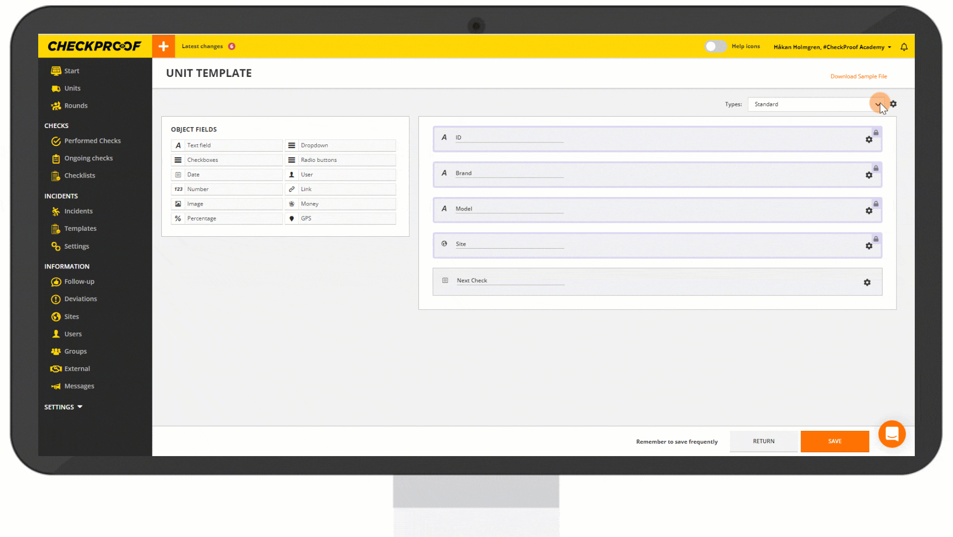 Just like a checklist, you can edit the template by dragging and dropping the fields that you want to add to the unit template.