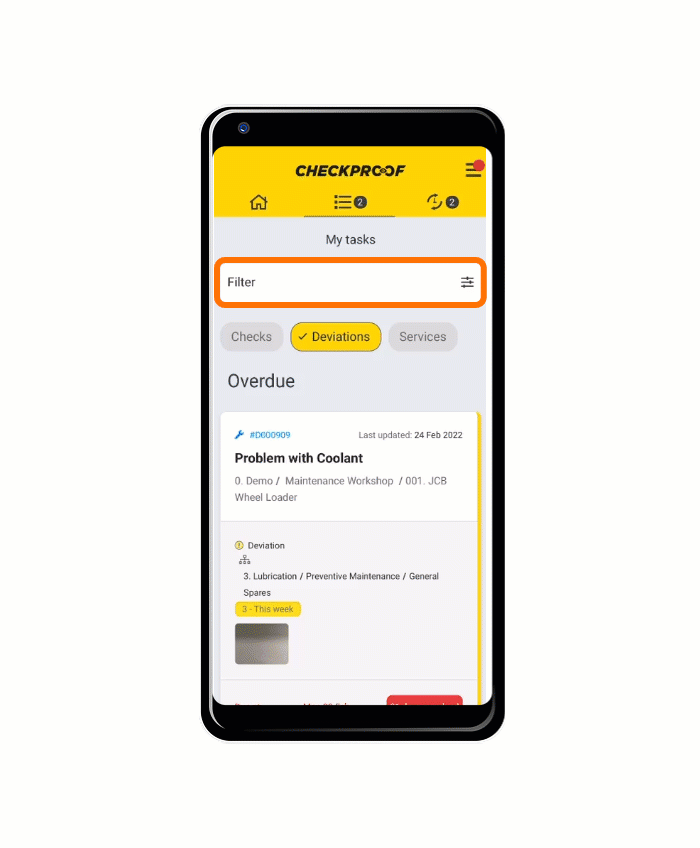 From the “My Tasks” menu, you can view all of your checks, deviations, and services. In this case, we have selected “Deviations” to view all active deviations.