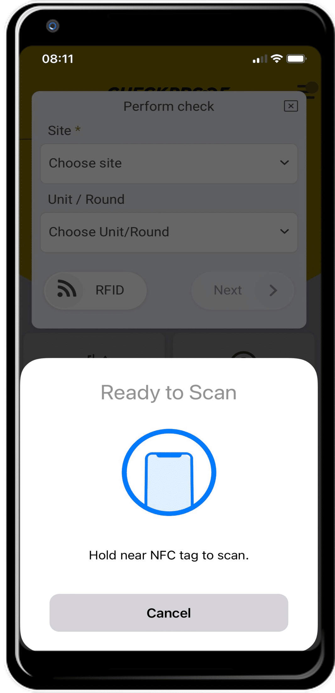 Now your mobile phone is ready to scan. Hold it near the NFC tag of a unit/round that you want to perform a check on.