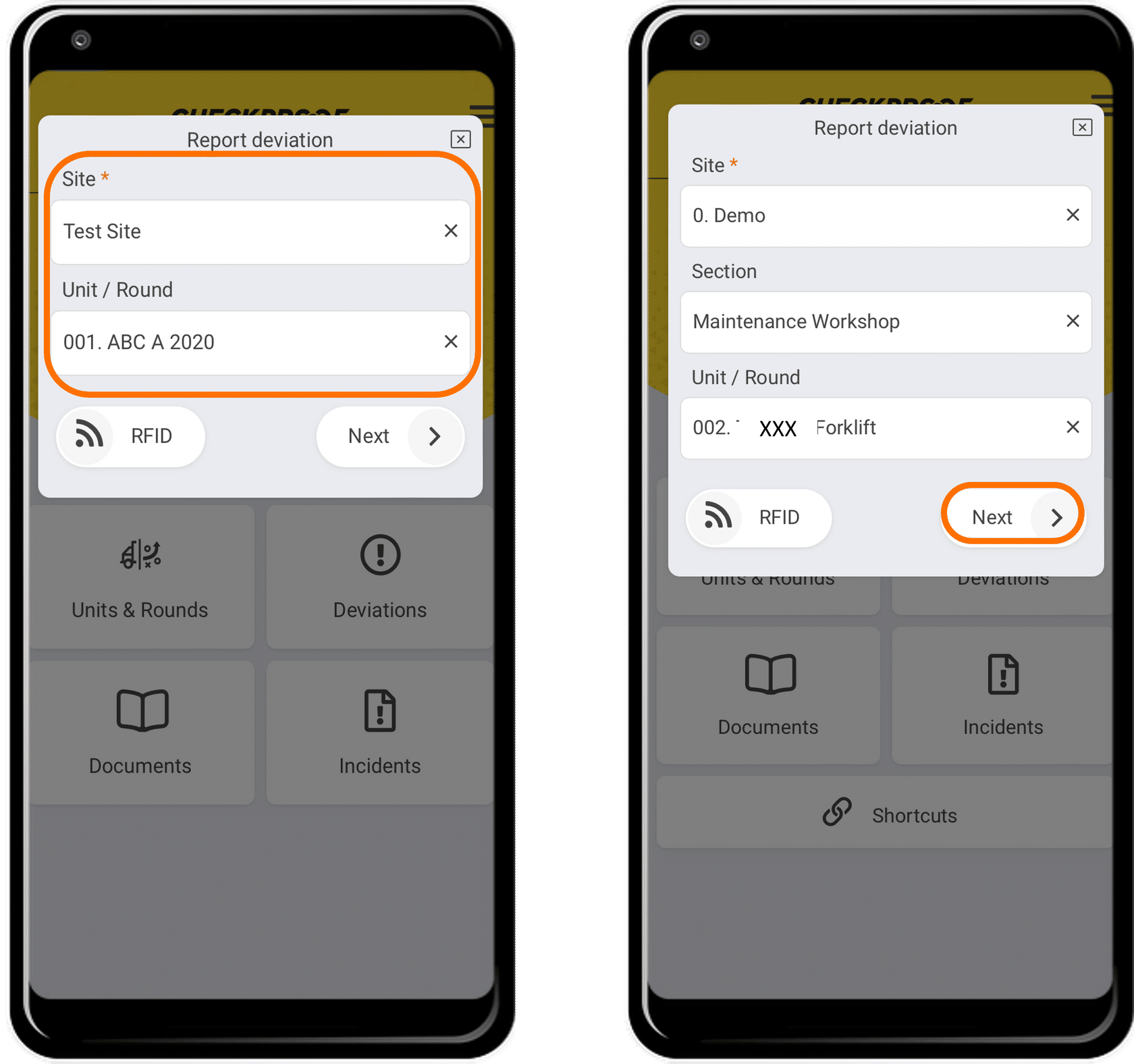The only difference between creating a deviation directly from a check is that you now need to select the “Site” and “Unit/Round” you are referring to.