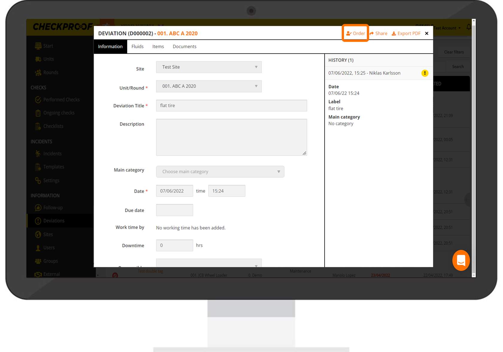 Now you will be able to view and edit information related to this deviation. Click the “Order” button at the top of the screen.